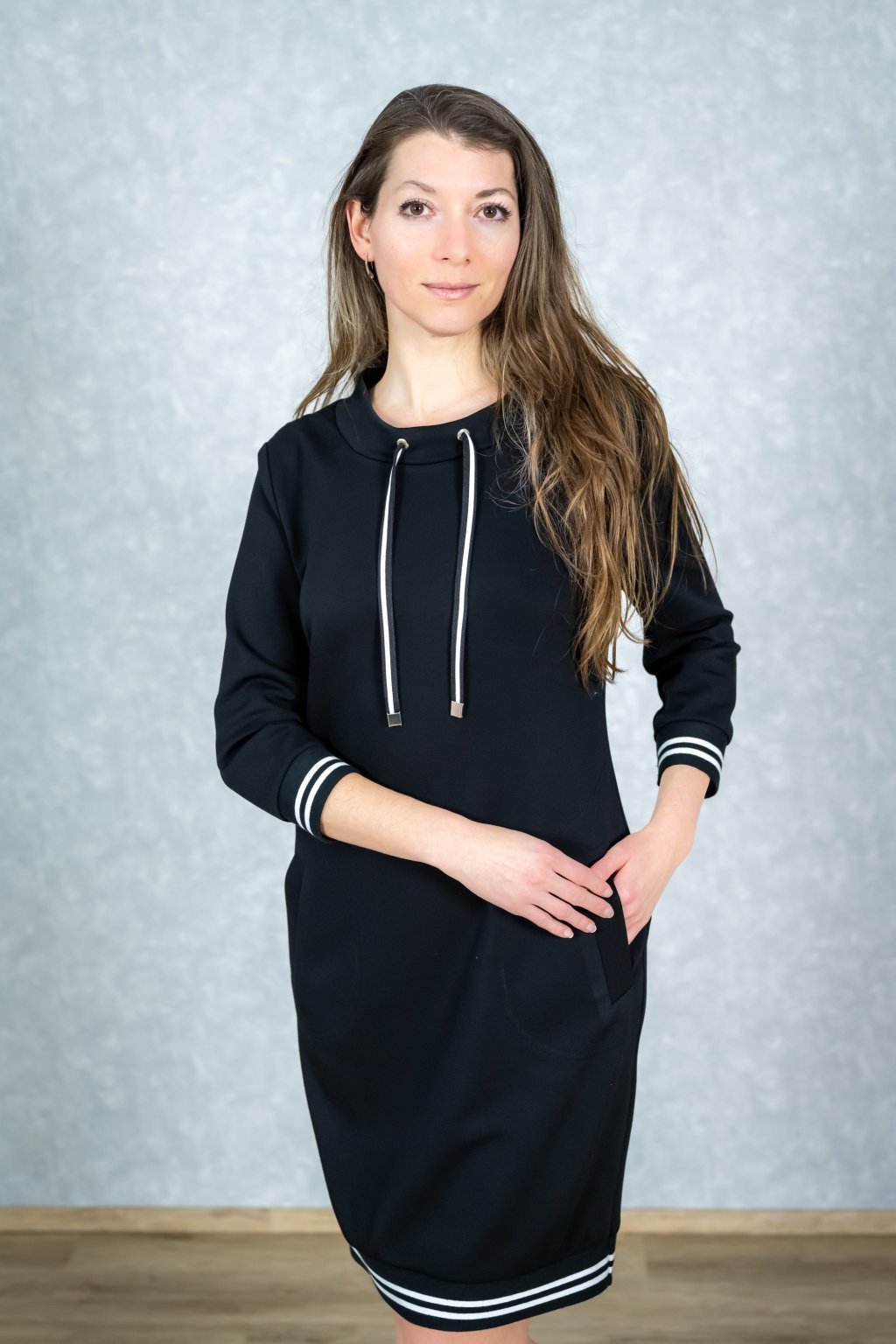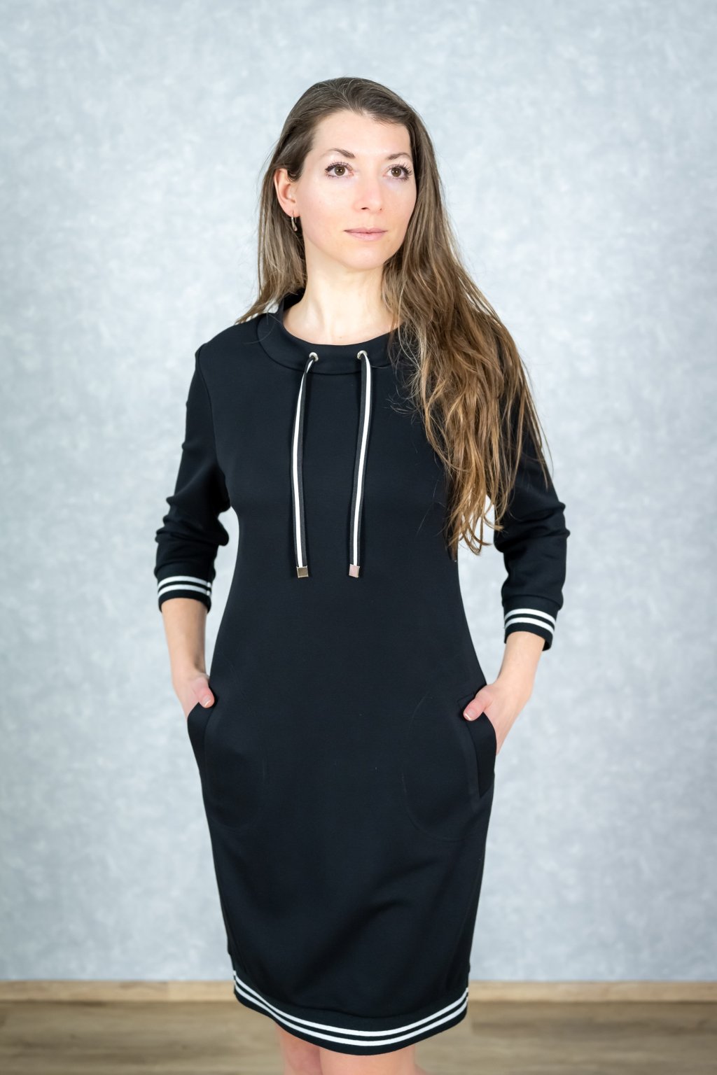 Tyto černé šaty z materiálu Scuba jsou přesně tím kouskem, který vám dodá sebevědomí i maximální pohodlí. Díky modernímu střihu s volným stojáčkem a pruhovanými lampasy působí svěžím sportovně-elegantním dojmem, který navíc opticky krásně protáhne postavu. Materiál je na těle neuvěřitelně příjemný a skvěle drží tvar, zatímco lištové kapsy přidávají na praktičnosti pro váš každodenní styl.