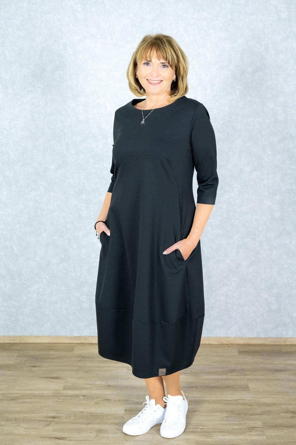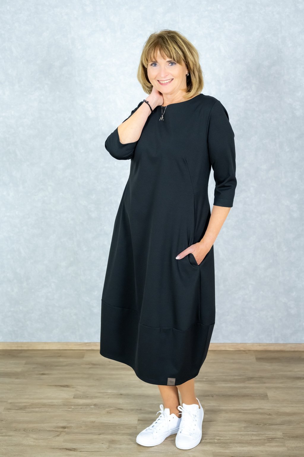 Tyto černé balónové šaty jsou důkazem, že i elegance může být neuvěřitelně pohodlná. Materiál je krásně pružný a na kůži tak příjemný, že je nebudete chtít sundat. Volnější střih s tříčtvrtečními rukávy lichotí každé postavě a skryje případné nedokonalosti, zatímco nepostradatelné kapsy dodávají šatům ten správný šmrnc a praktičnost pro každý den.