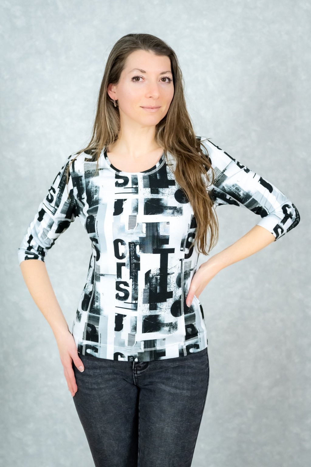 Vneste do svého šatníku moderní dynamiku s tímto černobílým tričkem, které díky originálnímu vzoru písma okamžitě upoutá pozornost a podtrhne vaši osobnost. Praktické tříčtvrteční rukávy vám dodají pocit ženskosti a zároveň zajistí maximální pohodlí během celého dne, ať už vás čeká cokoli. Tento sportovně-elegantní kousek je ideálním základem pro dny, kdy se chcete cítit šik, uvolněně a zkrátka naprosto svá.